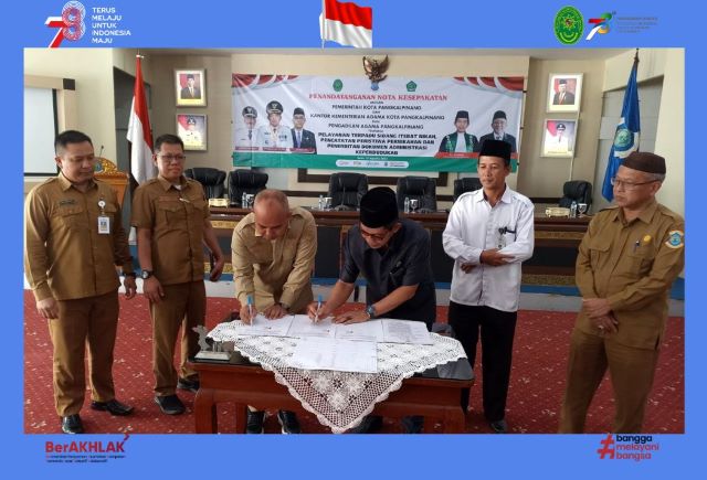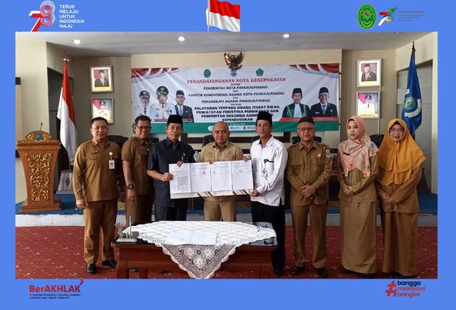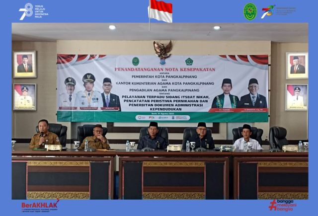 pa.pangkalpinang.go.id// Senin, 21 Agustus 2023. Ketua Pengadilan Agama Pangkalpinang Bapak Drs. Husniadi, M.H. didampingi Hakim Nurholis panitera ibu Helmawati, S.H dan sekretaris Bapak Huroiroh, S.IP menghadiri penandatangan nota kesepakatan bersama pemerintah kota Pangkalpinanang, Kementerian Agama dan Dinas Kependudukan dan Pencatatan Sipil Kota Pangkalpinang tentang pelayanan terpadu sidang itsbat nikah, pencatatan peristiwa pernikahan dan penerbitan dokumen administrasi kependudukan.