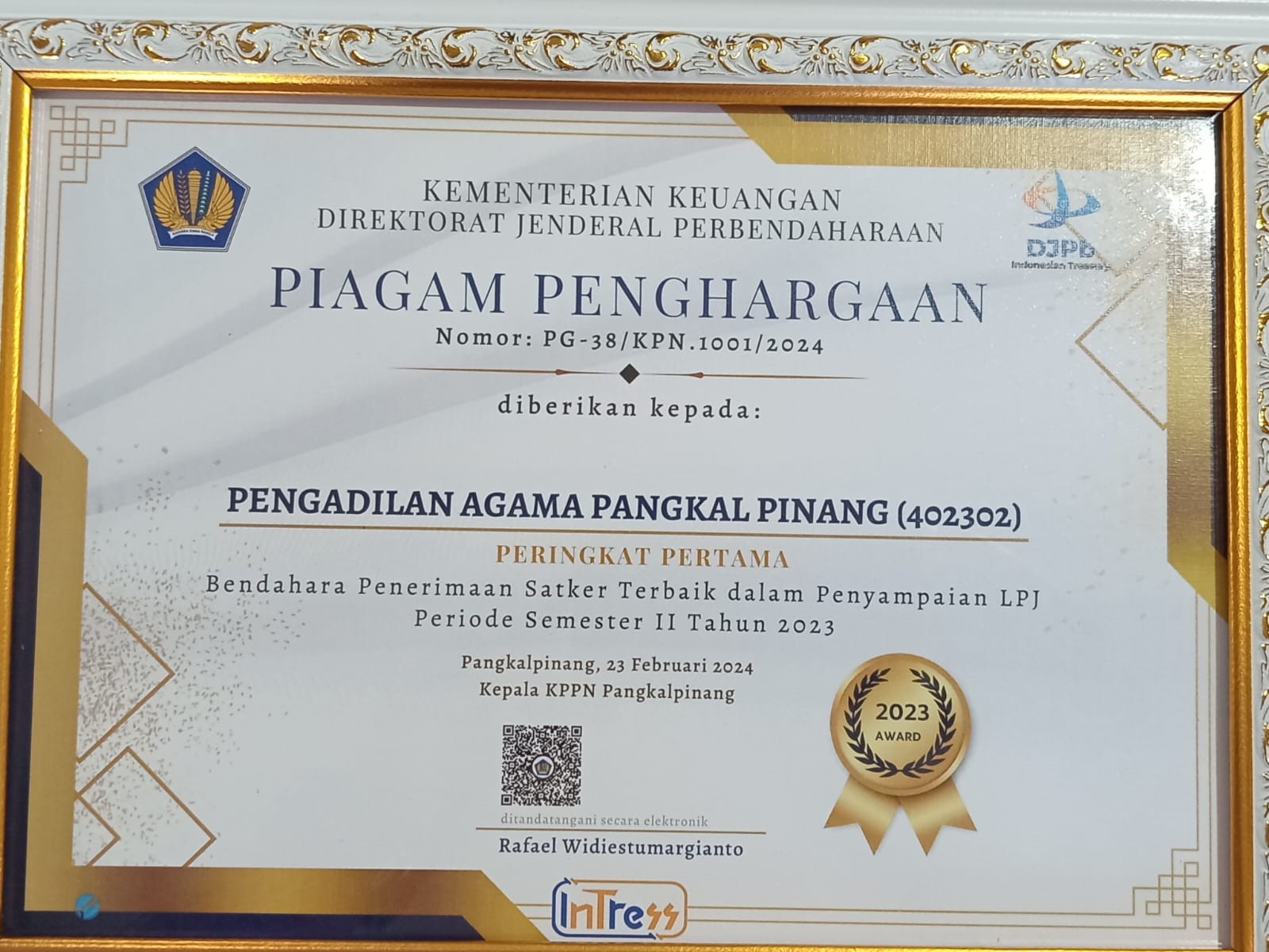 Pada kesempatan kali ini Pengadilan Agama Pangkalpinang mendapatkan penghargaan dari KPPN Pangkal Pinang dengan Nominasi Peringkat Pertama Bendahara Penerimaan Satker Terbaik dalam Penyampaian LPJ Periode Semester II Tahun 2023. Penghargaan ini diterima langsung oleh Sekretaris Pengadilan Agama Pangkalpinang Huroiroh, S.I.P. dan Bertempat di Aula Menumbing KPPN Pangkalpinang.