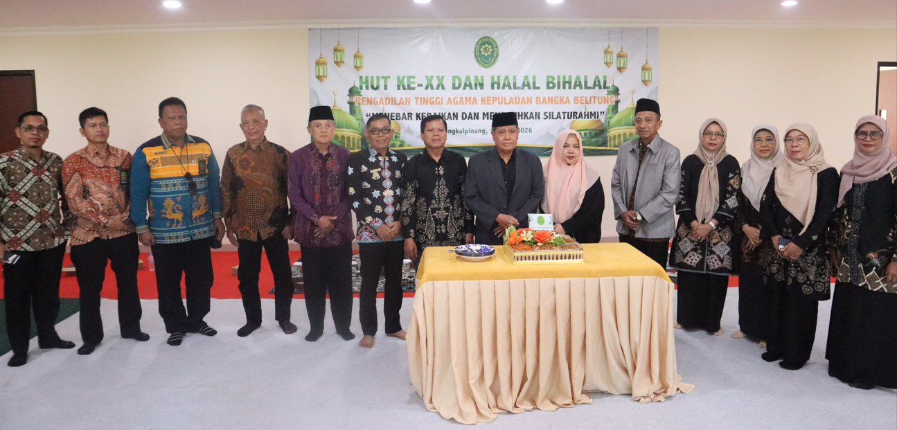 PANGKALPINANG, pta-babel.go.id — Dalam suasana penuh kebersamaan dan semangat, Pengadilan Tinggi Agama Kep. Bangka Belitung memperingati hari ulang tahunnya yang ke-20 pada 11 April 2026. Acara sekaligus dirangkai dengan Halal Bihalal Keluarga Besar Pengadilan Tinggi Agama Kepulauan Bangka Belitung berlangsung di Ruang Aula Pertemuan ini dihadiri oleh seluruh Hakim, Aparatur dan Keluarga Besar Pengadilan Tinggi Agama Kep. Bangka Belitung serta Ketua, Wakil Ketua, Panitera, Sekretaris serta Aparatur Pengadilan Agama Sewilayah Pengadilan Tinggi Agama Kepulauan Bangka Belitung yaitu Pengadilan Agama Pangkalpinang Kelas I A, Pengadilan Agama Sungailiat Kelas I B, Pengadilan Agama Tanjungpandan Kelas I B dan Pengadilan Agama Mentok Kelas II.